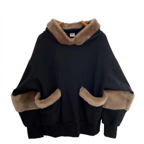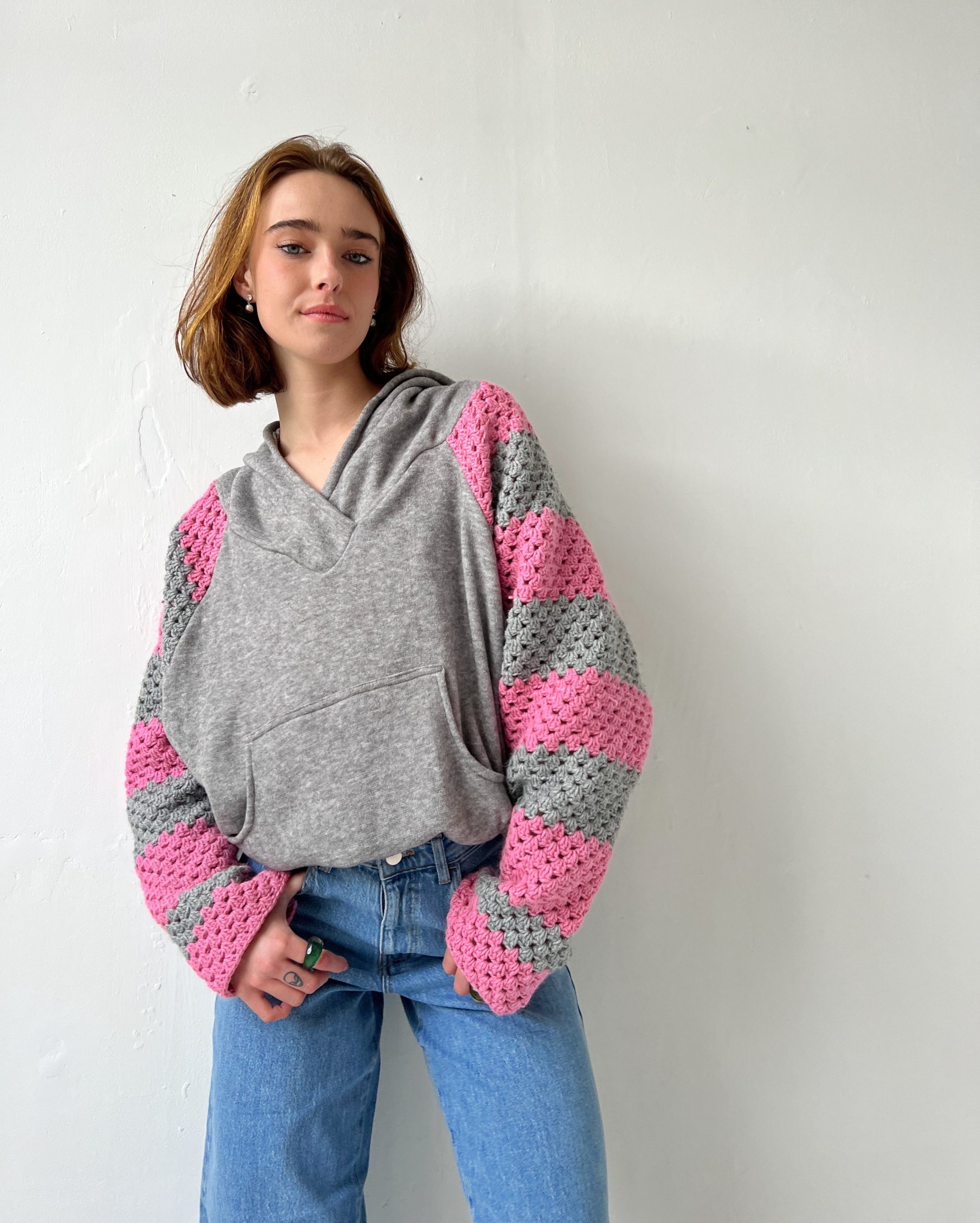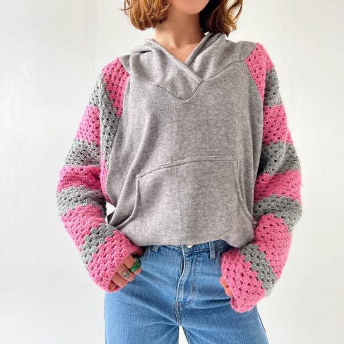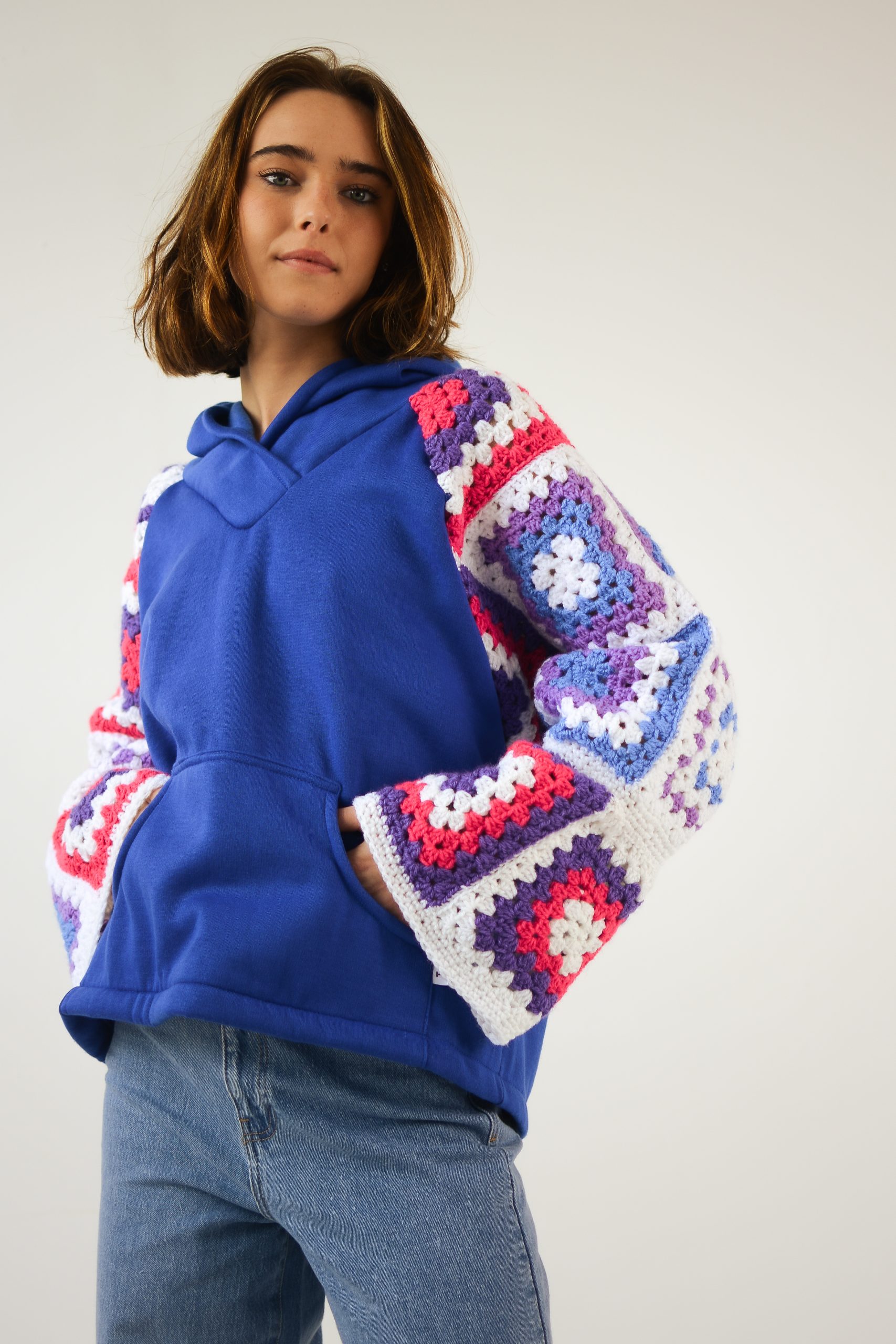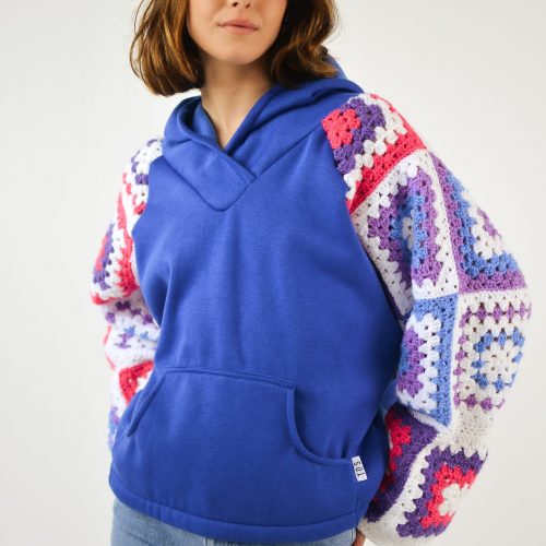 £120.00In for Spring! Our beautiful new hooded sweatshirt made from blue soft sweatshirt with hood, front pocket and colourful crochet flare sleeves in white, pink and purple. The style is slightly over-sized and slightly cropped / flared. Handmade and one of a kind.