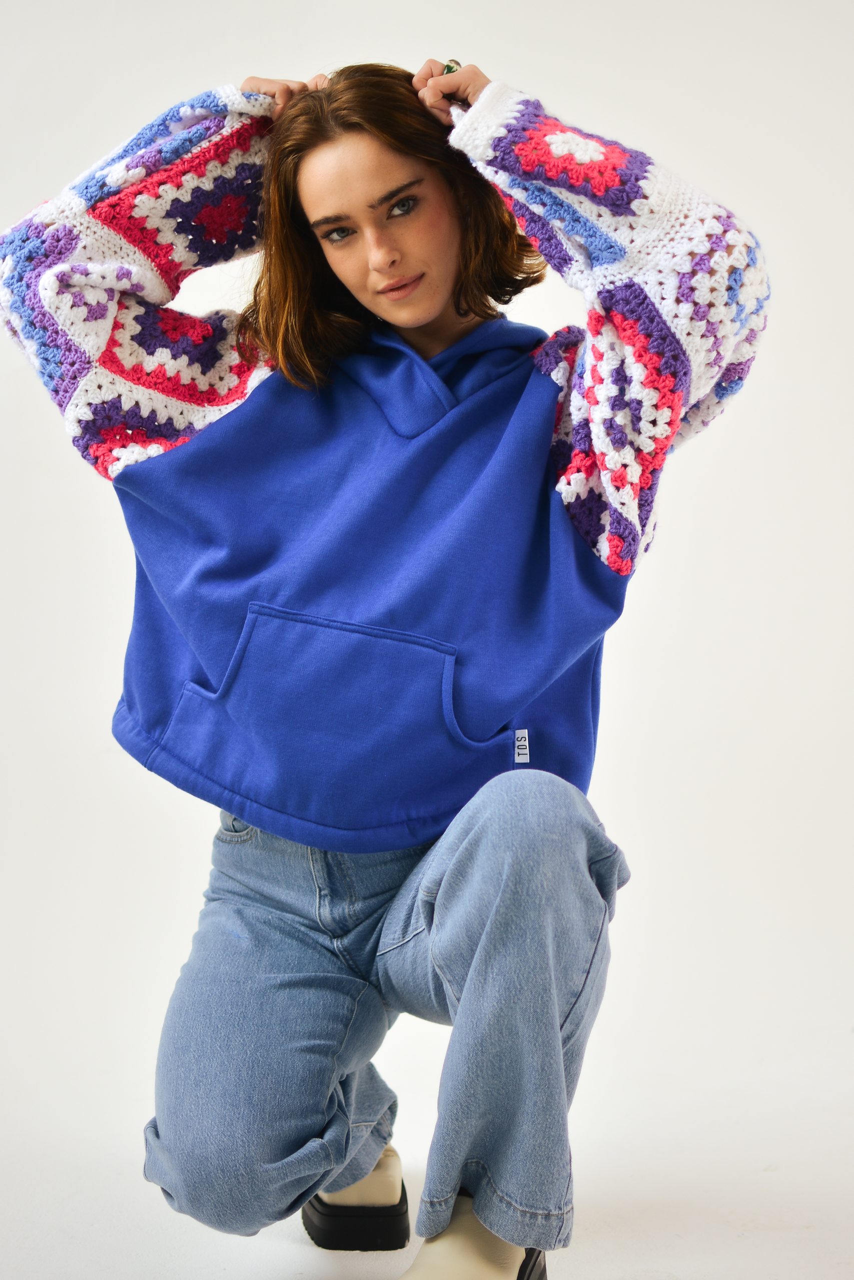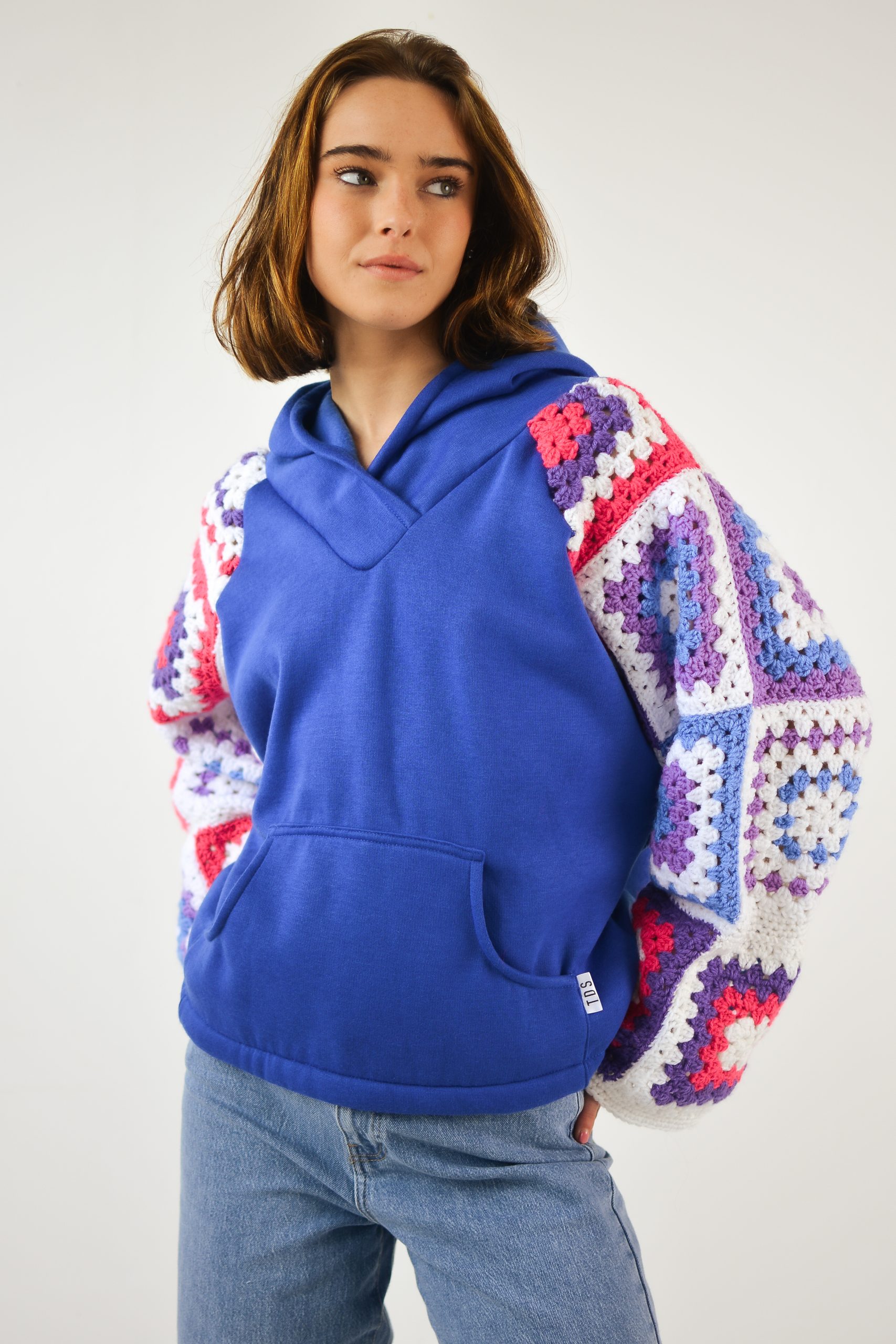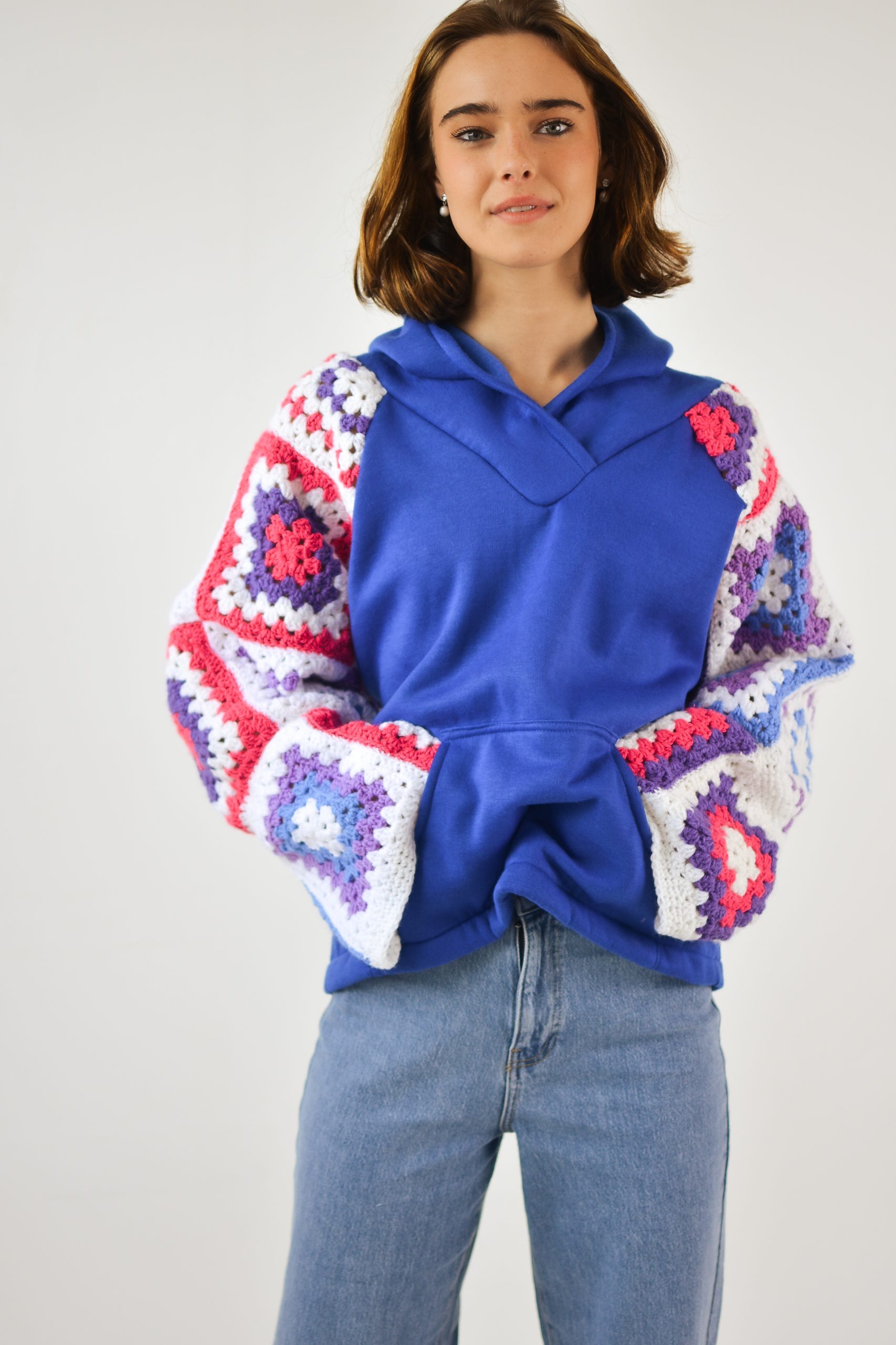In for Spring! Our beautiful new hooded sweatshirt made from blue soft sweatshirt with hood, front pocket and colourful crochet flare sleeves in white, pink and purple. The style is slightly over-sized and slightly cropped / flared. Handmade and one of a kind.