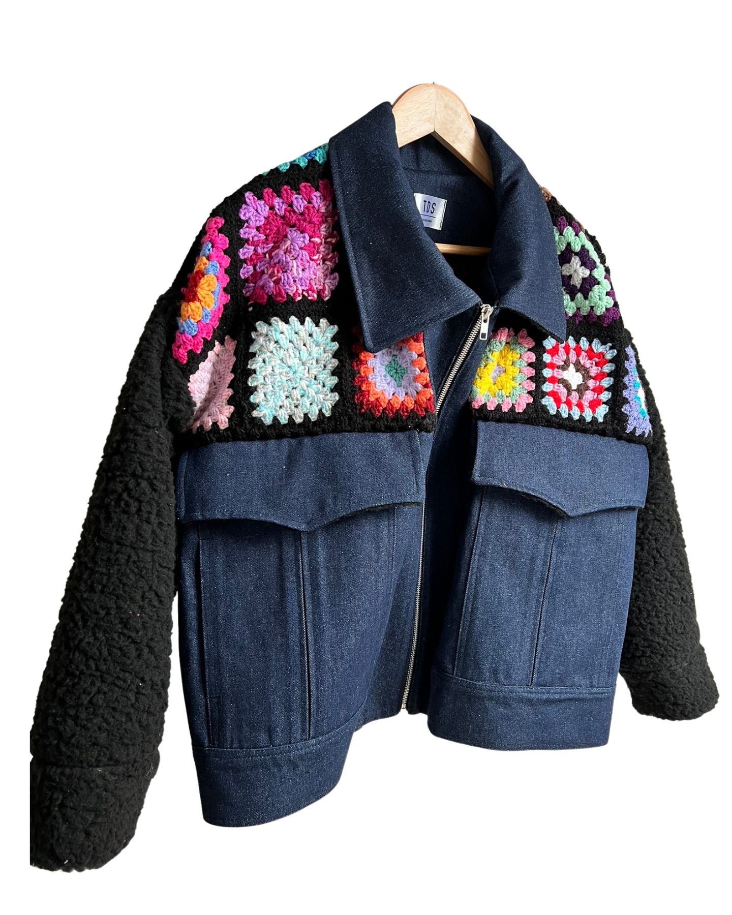 The style is ‘boxy’ with plenty of room to layer up underneath. Handrcrochet yoke in colourful crochet squares, with statement collar in denim. Both pockets and collar are lined in shearling for added detail. And who doesn’t love a pleated patch pocket. Finished with 20″ metal zip.